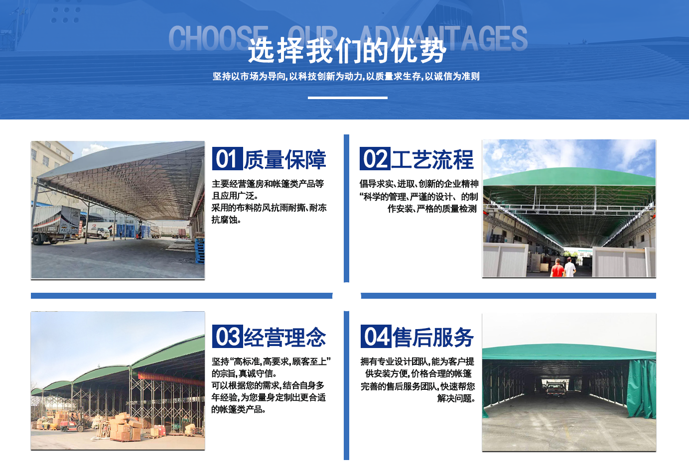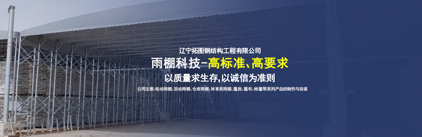 遼寧拓圖鋼結構工程有限公司是一家專業從事推拉篷設計、制作、安裝、使用、維修的綜合性公司。公司主營:電動雨棚、活動雨棚、倉庫雨棚、體育類雨棚、篷房、篷布、帳篷等系列產品的制作與安裝。 遼寧拓圖鋼結構工程有限公司堅持以市場為導向,以科技創新為動力,以質量求生存,以誠信為準則,倡導求實、進取、創新的企業精神?!翱茖W的管理、嚴謹的設計、 的制作安裝、嚴格的質量檢測、良好的后期服務成就企業的信譽,為您提供優質服務?! ?nbsp; 遼寧拓圖鋼結構工程有限公司傾力于開發應用三維空間結構與新材料的結合,將廣告藝術視覺表現形式與張力膜材科學的結合,推出多彩推拉蓬,依靠先進的科學技術,將推拉蓬建筑表現形式無限延伸,立志走在建筑科學的前沿,引導建筑時尚潮流,我們的目標是使推拉蓬建筑在中國發展壯大。 遼寧拓圖鋼結構工程有限公司憑著極強的事業熱情和豐富的專業經驗以“勤勉進取、銳意創新、至誠至信”的精神使公司得到迅速健康發展,業務范圍遍及全國??茖W的管理、嚴謹的設計、高標準的制作安裝流程,嚴格把控產品質量,熱誠的售后服務是企業競爭力的源泉。 遼寧拓圖鋼結構工程有限公司人愿以最誠摯的態度,歡迎廣大客戶的蒞臨與溝通!愿為市場提供優...